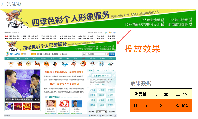 投放平台及方式:腾讯效果广告平台(腾果平台)上投放图片广告、FLASH动态广告展示; 点击广告进入四季色彩首页