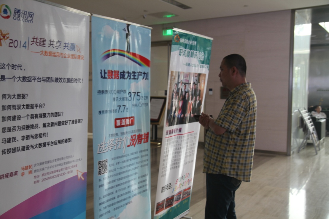 【讯果科技 最新快讯】6.29日下午在汉阳古琴台天下名企汇举办的一场企业管理层交流讨论会圆满落幕。会议主讲由武汉巅峰荣耀企业管理有限公司创办人马建民老师和腾讯效果广告平台华中地区营销服务中心负责人李明李总担任。诸多中小型企业参加了此次会议。其中不乏大型企业的高管,如长城宽带、工商银行、富山河装饰等。