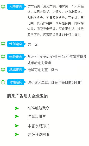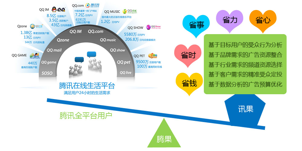 选择腾果广告可以撬动8.5亿的QQ用户,每日覆盖超过3亿互联网活跃用户,可为每一位客户提供CPC的精准定向服务,为广告客户的广告效果保驾护航。